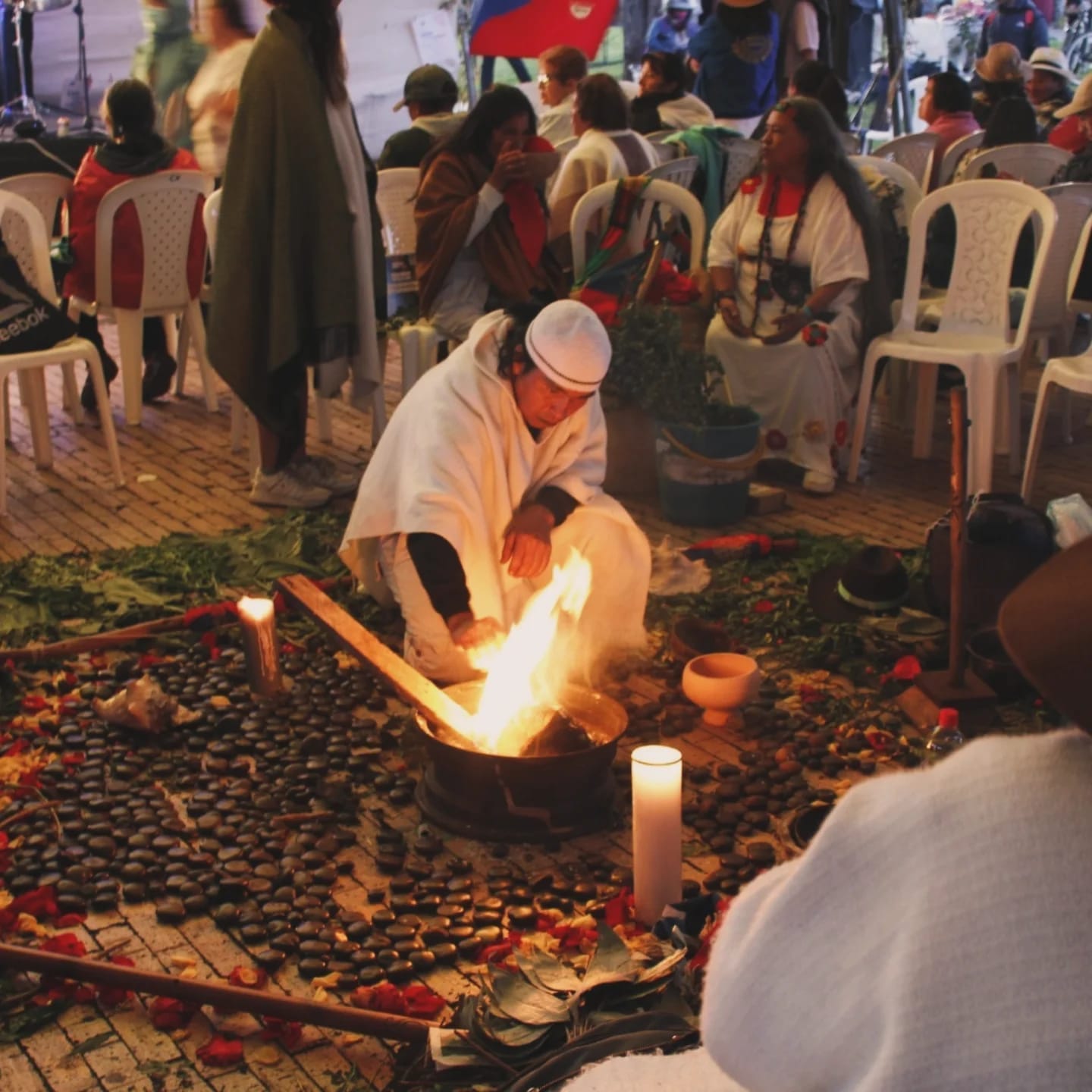 Momento del ritual de apertura que marca el inicio de las festividades. Este acto simbólico, acompañado por fuego y elementos naturales, representa la conexión espiritual y el respeto por las tradiciones ancestrales.