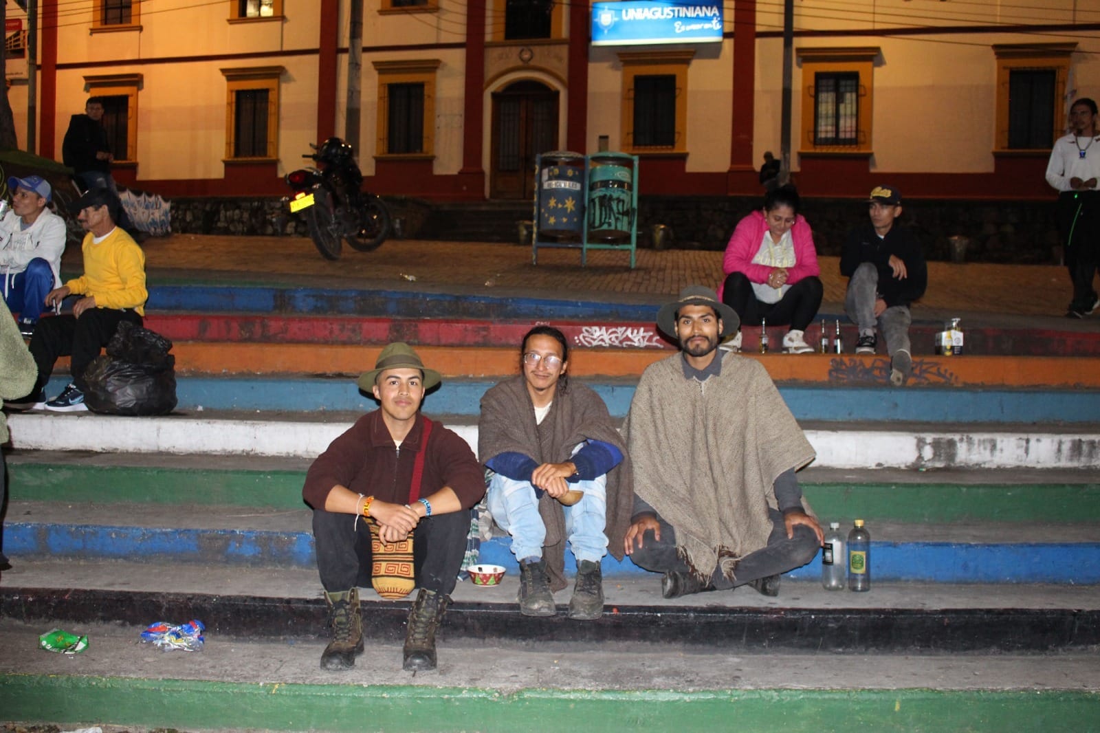 Tres personas del Cabildo se encuentran sentadas en las escaleras, participando en una de las actividades realizadas durante la jornada. La imagen refleja el encuentro, la conversación y la presencia colectiva en los espacios urbanos.