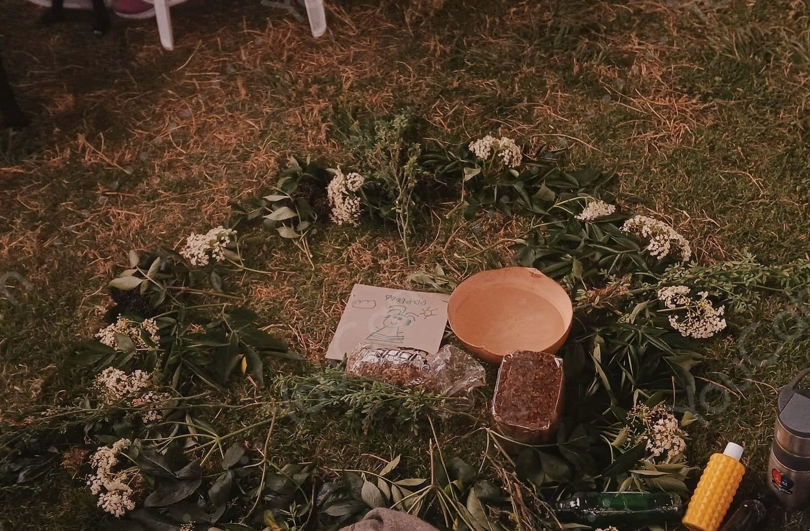 Sobre el pasto se forma un círculo con plantas, flores y objetos simbólicos. Este espacio ritual honra la vida, la tierra y la memoria, integrando lo espiritual con lo cotidiano.