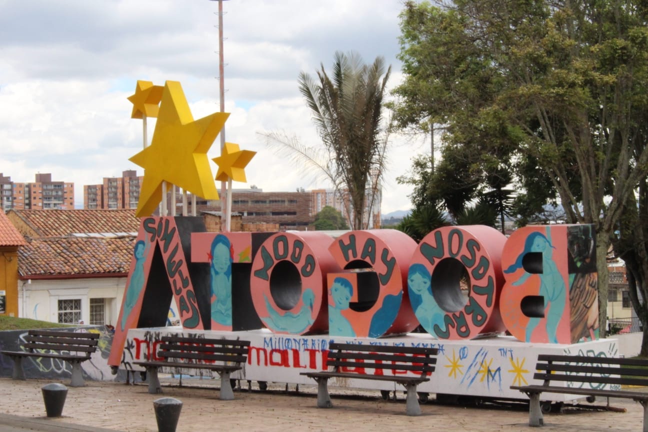 El monumento urbano con letras coloridas refleja la presencia de la modernidad dentro del territorio. Esta imagen contrasta los elementos contemporáneos con las raíces culturales que siguen vivas en la comunidad.